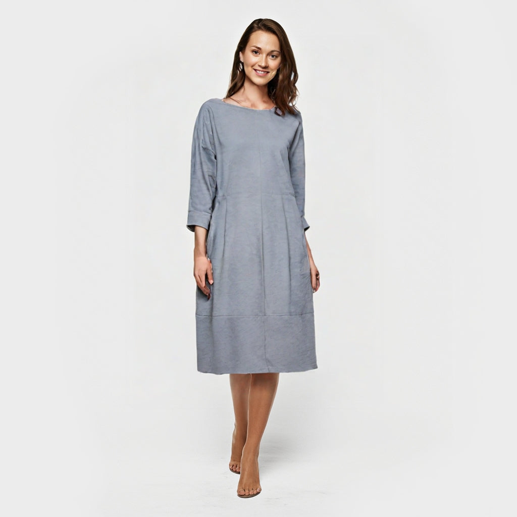 Upplev stil och komfort med denna eleganta A-linjeformade klänning i mjuk bomullsblandning. Med en smickrande båtringning, trekvartsärmar och praktiska fickor är den perfekt för både vardag och avslappnade tillfällen.