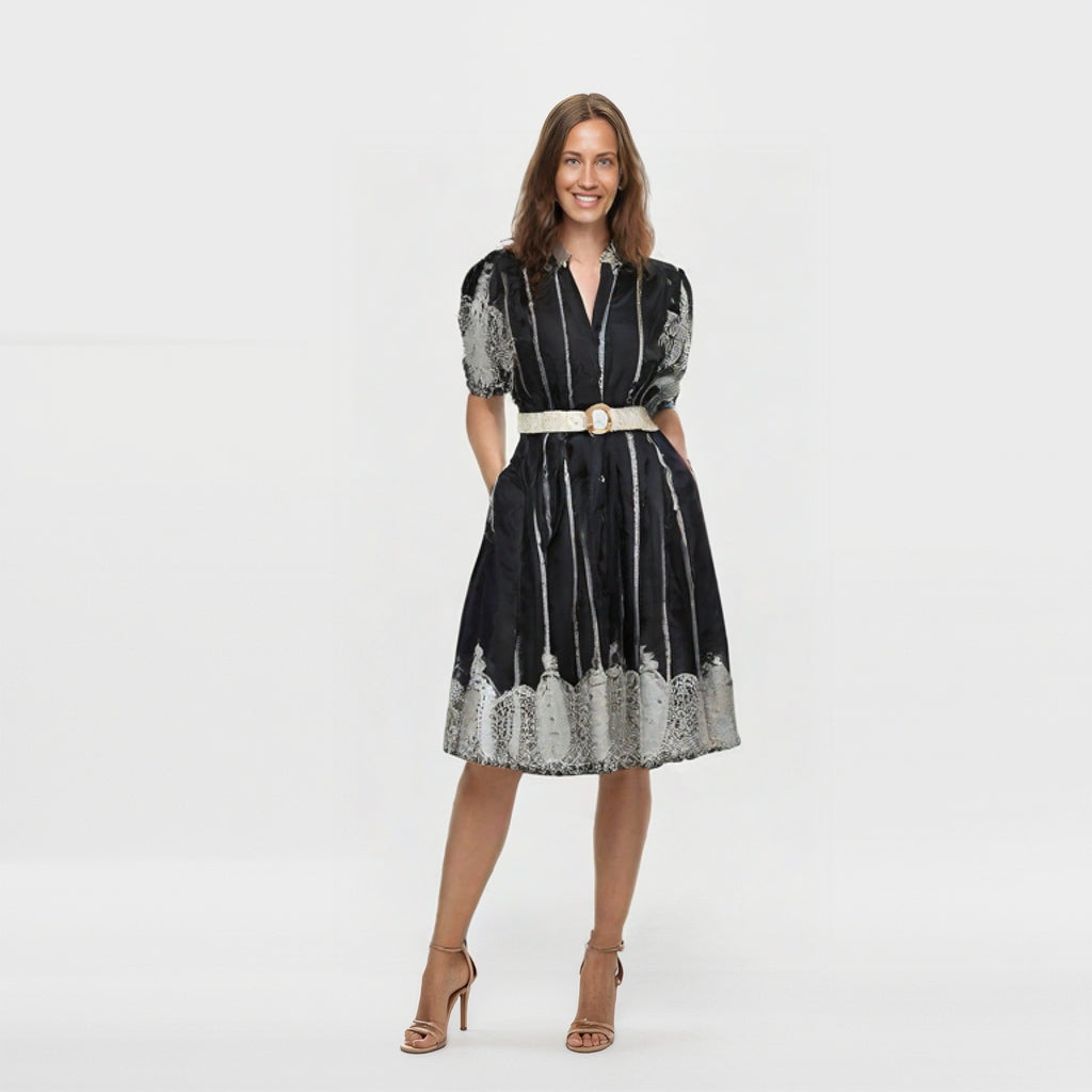 Med sina vackra spetsdetaljer, puffärmar och en smickrande midjebälte skapar den en sofistikerad silhuett.